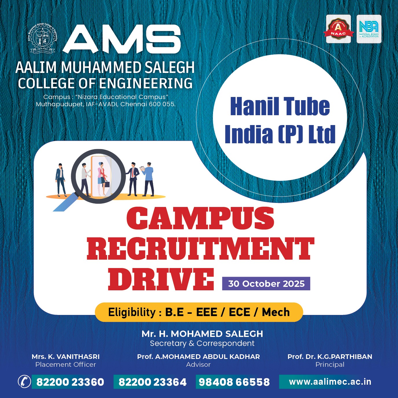 October 30 @ 8:00 am Campus Recruitment Drive Aalim Muhammed Salegh College of Engineering, Avadi-IAF, Chennai, Tamil Nadu 600055 India + Google Map